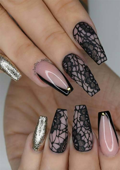L'effetto opaco funziona magnificamente bene con il design delle unghie in acrilico dipinto con pizzo a rete, mentre l'unghia del mignolo dorato scintillante e l'unghia curata lucida e arricchita da borchie dorate lavorano insieme per un coeso, aspetto elegante.