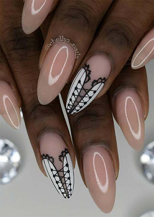 La combinazione di unghie neutre con un aspetto lucido funziona con il corsetto gessato dettagliato dipinto sull'unghia anulare opaca.