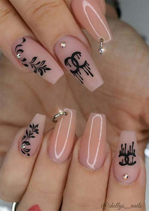La ricchezza del marrone opaco sulle unghie acriliche a forma di bara è così magnificamente completata dalle pietre ingioiellate e dagli abbellimenti a catena metallica. Anche l'aggiunta di minuscole pietre nere come accenti è sorprendente.
