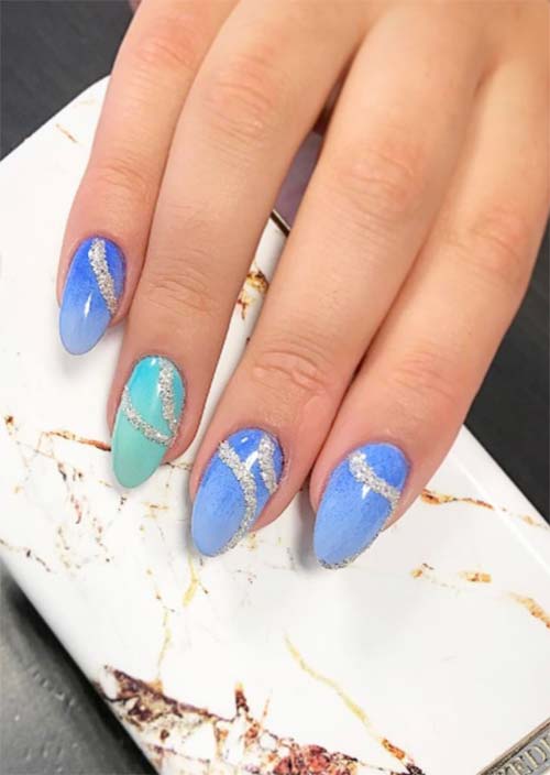 Le sfumature del blu sono accentuate da volute e riccioli di linee scintillanti che enfatizzano il flusso delle unghie acriliche. Il design è interessante di per sé, ma assume una vita reale sulle unghie a forma di mandorla colorate di blu.