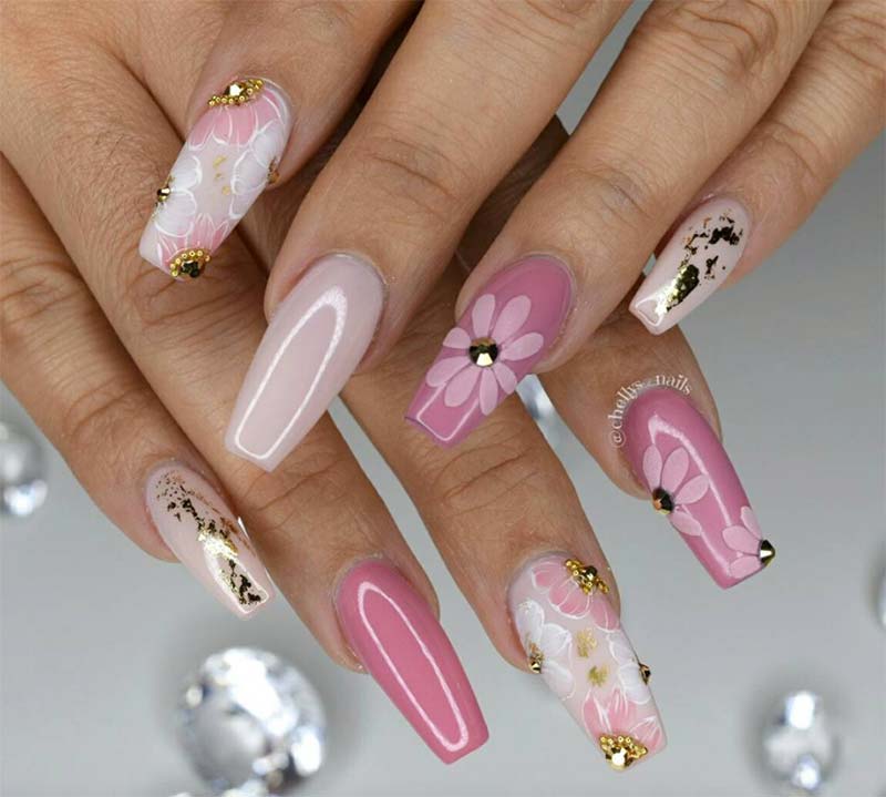 Queste unghie acriliche a tema primaverile mostrano molta arte, dalle borchie alle perline, fiori dipinti a mano e spruzzi d'oro su un rosa tenue e profondo.