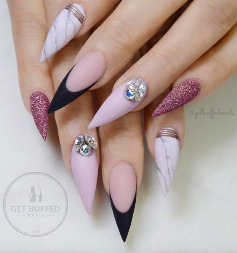 La nail art qui è eccezionale:un luccichio o un abbellimento in metallo su ogni unghia e la giusta quantità per mantenerlo interessante. Questo look è la perfetta combinazione di marmorizzato, unghie acriliche a stiletto glitterate e lavorate in metallo.