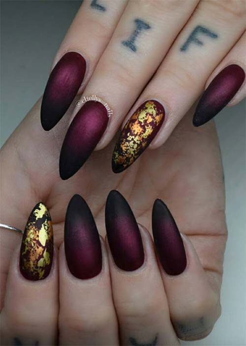 La combinazione di un ricco smalto bordeaux con ombre nere su unghie acriliche a stiletto è stupefacente da sola, soprattutto con la lucentezza del bordeaux, anche se lo stile è opaco. L'oro e il rame presenti sulle unghie dei riflettori sono un tocco di lusso incredibile e inaspettato.