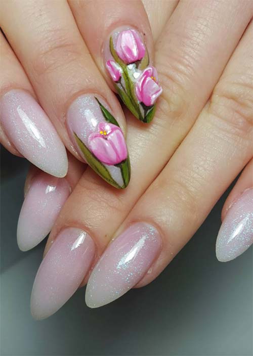 La nail art è sempre spettacolare, e qui la presenza dei tulipani, evidenziato in modo realistico su uno sfondo scintillante di verde blu su unghie acriliche neutre è a dir poco fantastico.