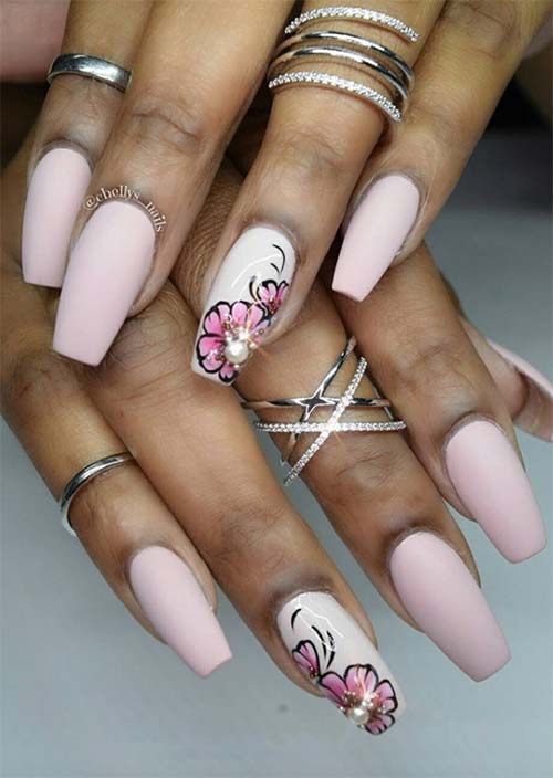 I fiori nei toni del rosa su uno smalto bianco lucido risaltano ancora di più con l'attento posizionamento delle perle al centro. Le altre unghie in morbido rosa opaco chiaro sono realizzate in modo impeccabile.