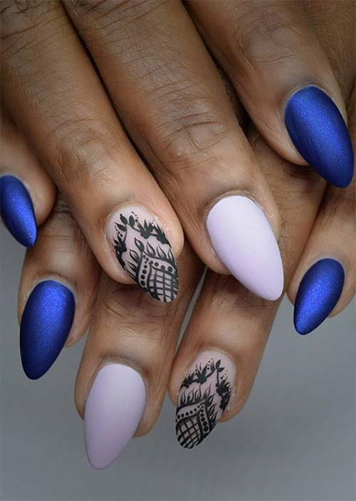 L'ombra scintillante di questo blu reale opaco è accentuata magnificamente dall'arte dipinta a mano sulle terze unghie. Le unghie acriliche bianche sembrano interessanti in contrasto.