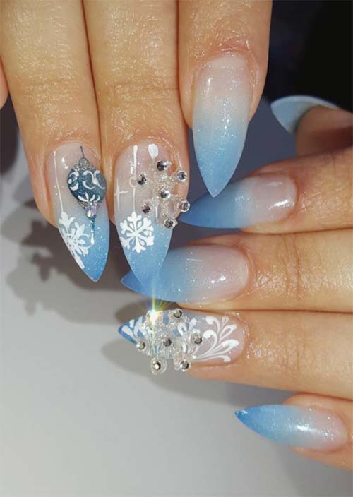 Celebra l'estetica invernale ogni volta che vuoi con un design per unghie in acrilico simile a questo ombretto bianco e blu quasi trasparente spolverato di glitter blu e caratterizzato da fiocchi di neve e ornamenti dipinti a mano. Anche un fiocco di neve tridimensionale viene premuto come caratteristica.