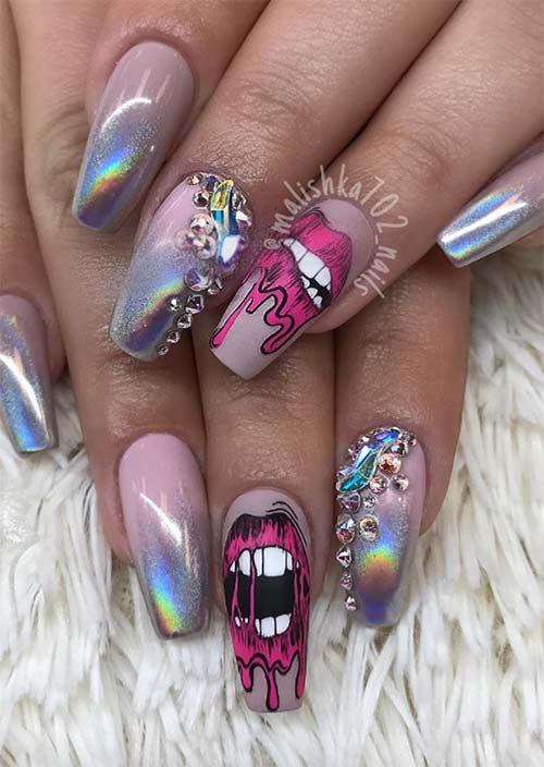 La nail art in acrilico su questo set è così sorprendente che è difficile sapere da dove cominciare. Le labbra dipinte sul nudo opaco sono quantomeno accattivanti, l'immagine che spunta chiaramente dall'unghia. Le punte iridescenti delle altre unghie acriliche a forma di bara sono un'ulteriore sorpresa inaspettata, e l'aggiunta di pietre è un finale da apprezzare.