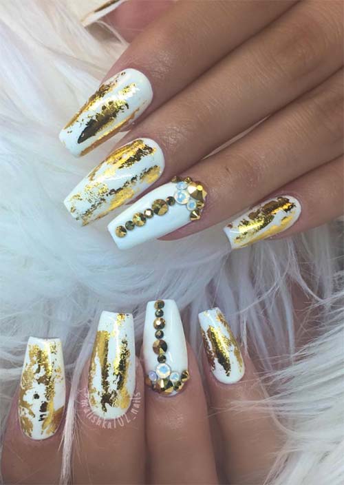 Le unghie acriliche dipinte di bianco sono rialzate con un aspetto dorato di oro spazzolato dappertutto. Le borchie dorate e le pietre scintillanti funzionano magnificamente bene insieme senza confondersi.