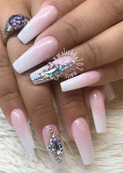 La forma e lo stile di queste unghie acriliche conferiscono una bellissima tela alla base rosa e alle punte bianche del design delle unghie, ma il tocco di glitter argento esalta davvero il rosa, e il posizionamento dettagliato delle pietre è un tocco di prim'ordine.