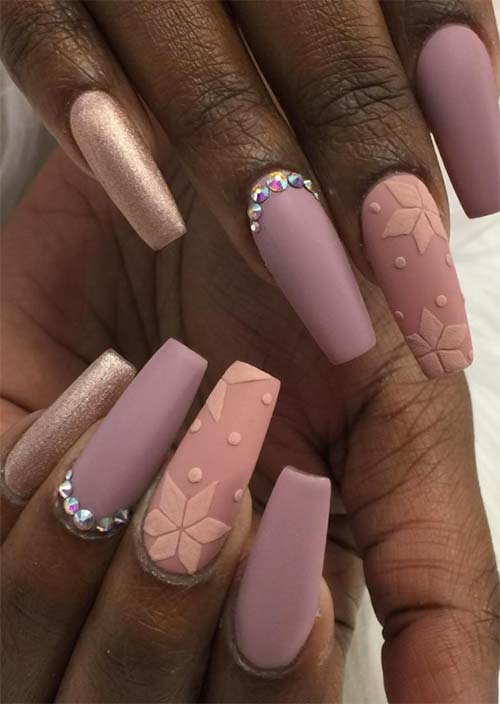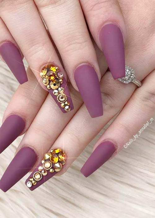 Lo smalto opaco è sempre bello, creando l'aspetto di unghie morbidamente strutturate. Gli abbellimenti dorati risaltano davvero sulla morbidezza dello sfondo malva.