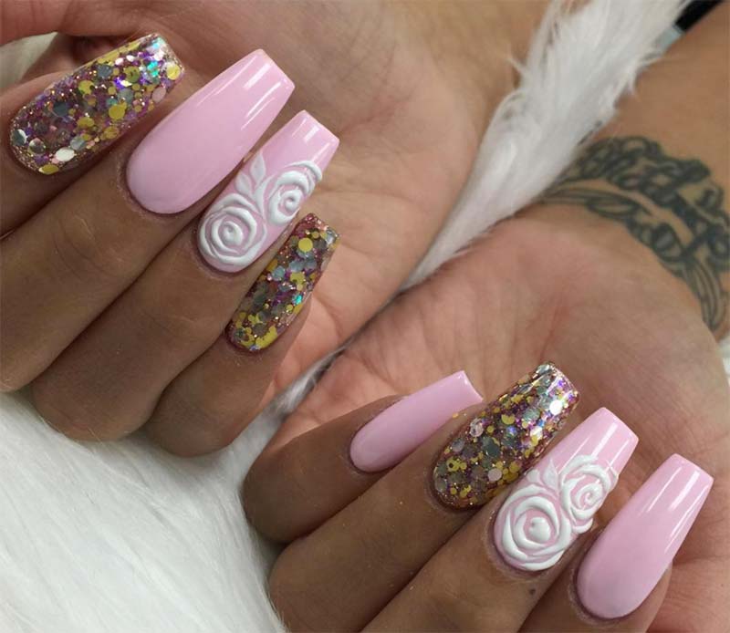 Le rose bianche in rilievo sul design delle unghie in acrilico sono un bonus di design strutturato che sembra bello sullo smalto rosa chiaro lucido. Anche l'inclusione del glitter rotondo sulle unghie adiacenti è un dettaglio interessante, rivestito bene in modo che lo scintillio non si stacchi con l'usura normale.