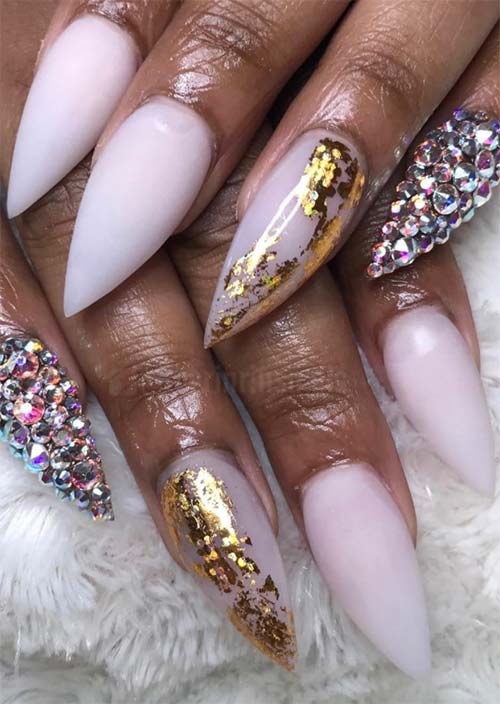 Le unghie acriliche a stiletto bianche sono la base perfetta per le striature dorate e il rivestimento di pietre su alcune delle unghie rosa. Il modo in cui le pietre si adattano così bene insieme incrostate sulle unghie è la perfezione.
