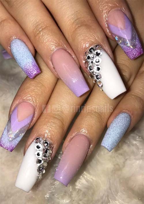 L'inclusione di pietre ben posizionate e glitter in stile coriandoli funzionano magnificamente bene insieme, alternati sulla forma dell'unghia lunga ballerina. Le unghie acriliche sono lucide, ma presentano le opzioni scintillanti piuttosto che lucide, e l'aspetto è fantastico.