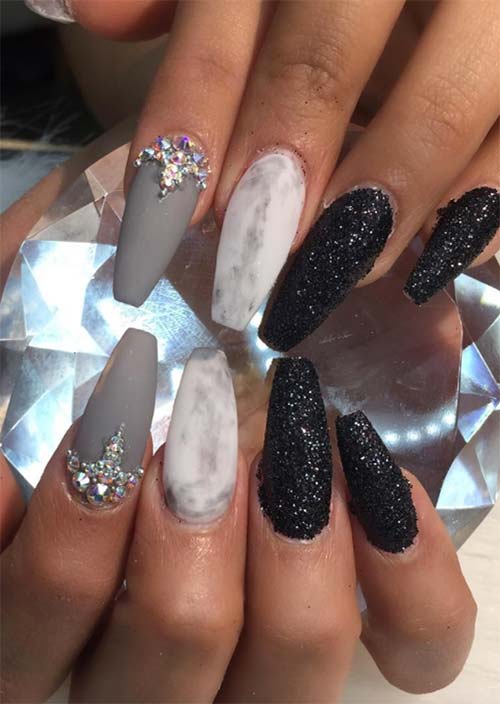 Le unghie nere possono essere realizzate in molti modi, qui presentato attraverso una finitura ricca di glitter scintillante strutturata accanto a un chiodo centrale grigio marmorizzato. L'unghia indice presenta unghie grigie opache e uno splendido abbellimento proprio alla base dell'unghia.