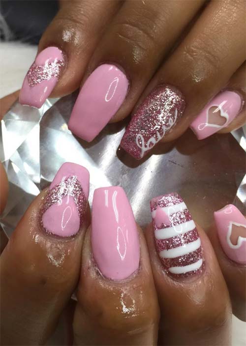 Ogni spettacolo di nail art è da sogno, parlando della tecnica e dell'abilità del tecnico. Qui l'uso dei brillantini, cuori e parole dipinti a mano e zucchero filato rosa mantengono queste unghie acriliche un passo avanti rispetto a un set di colori o glitter standard.