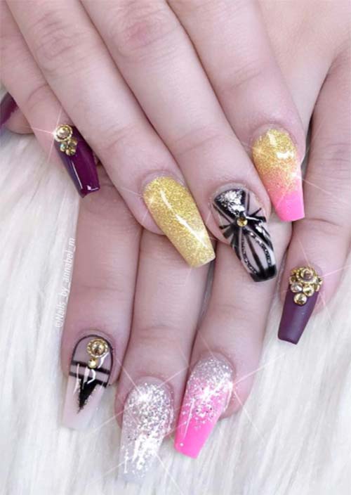 Ogni unghia è realizzata in modo diverso mostrando la versatilità dell'immaginazione con la nail art. Le ombre dall'oro al rosa, la ricchezza del viola intenso con la lucentezza a specchio, il viola opaco e le unghie acriliche spolverate di glitter sono tutte bellissime anche con le opzioni dipinte a mano su chiare.