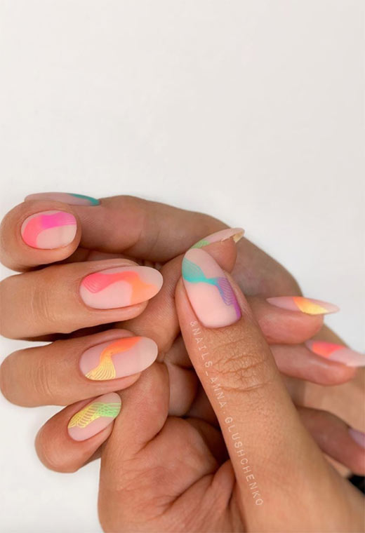 Questa manicure estiva dimostra che puoi ottenere di più con meno. L'abbondanza di colori è d'obbligo, ma altrimenti, questo disegno è molto semplice, con curve astratte disegnate sulle unghie nude a mano libera.