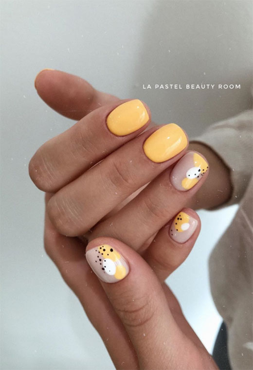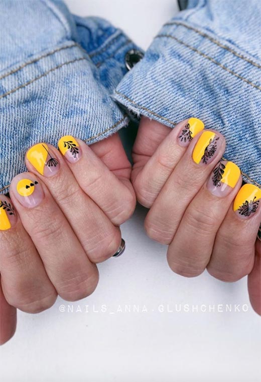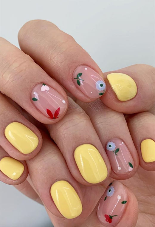 La nail art sulle unghie nude è molto trendy, e apprezziamo questa interpretazione particolarmente adorabile. Le unghie nude erano ricoperte di piccoli disegni floreali, così come uno strato di lucentezza, mentre il resto delle mani è un giallo semplice e vibrante.