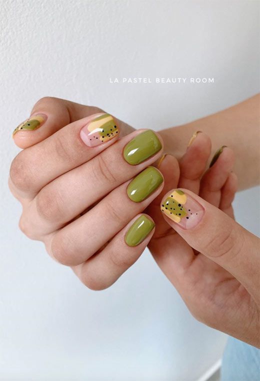 Il verde oliva non è il primo colore che ci viene in mente quando pensiamo all'estate, ma quando combinato con il giallo, in realtà funziona perfettamente per la stagione calda. La tonalità oliva qui è abbastanza chiara e lucida, mentre l'unghia accento illumina ancora di più le cose con un design giallo e verde a mano libera sormontato da punti neri.