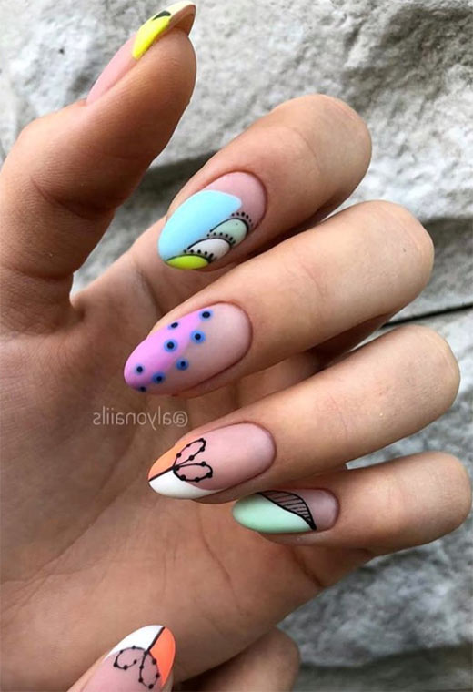 Questa volta, pois neri per unghie pastello! Dipingi le tue unghie di bianco, e poi aggiungi vari blocchi di rosa e giallo. Quindi gioca con punti neri di diverse dimensioni e distanziati per completare il look.