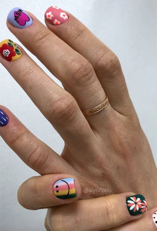 Più è di più in questo look, dove ogni unghia è decorata con un tipo di disegno floreale completamente diverso (e una faccina sorridente con strisce). La finitura opaca impedisce alla manicure di essere davvero dappertutto, ma puoi sicuramente prendere ispirazione da uno solo dei chiodi se vuoi qualcosa di più semplice.