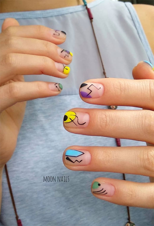 L'estate è la stagione perfetta per sperimentare con i colori delle unghie al neon. Questo disegno, anche se un po' ridicolo, mantiene anche i neon per essere esagerati usandoli per disegnare sulle unghie disegni che sembrano scarabocchi. I piccoli disegni a fumetti neri sulla nail art attenuano la luminosità pur essendo giocosi.