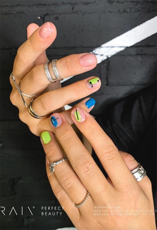 Queste brillanti tonalità di verde e blu sono perfettamente rinfrescanti per le unghie estive! Il modo in cui sono disegnate sulle unghie in quadrati con strisce nere aggiunte casualmente sulla parte superiore è un altro esempio di design delle unghie ispirato all'arte suprematista.