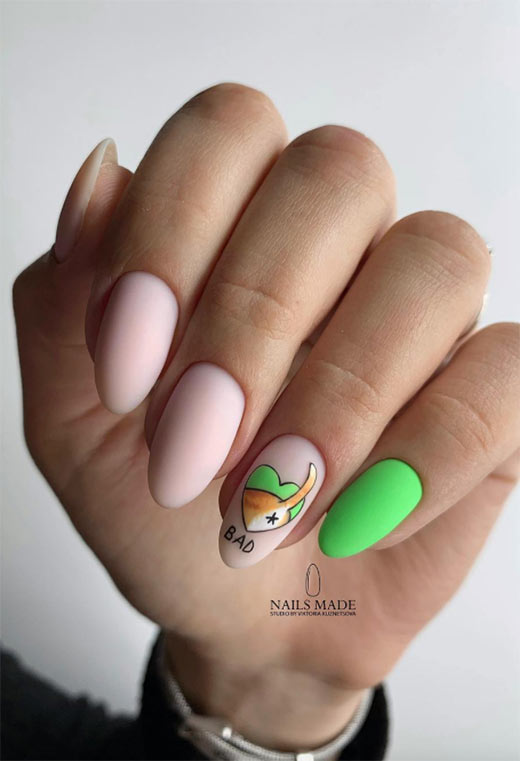 La chiave per far funzionare le unghie estive davvero ridicole è mantenere il resto della manicure più sofisticato. Le unghie verde opaco e nude sono sofisticate, quindi il ridicolo cartone animato del gatto riesce a risaltare davvero.