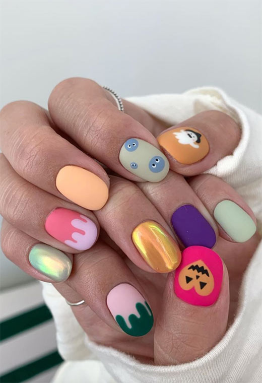 Questi brillanti colori caramelle sono perfetti per le unghie estive, anche se i disegni stessi ricordano Halloween. Amiamo la combinazione di texture, con alcune unghie mantenute opache e altre verniciate con smalto cromato ultra riflettente.