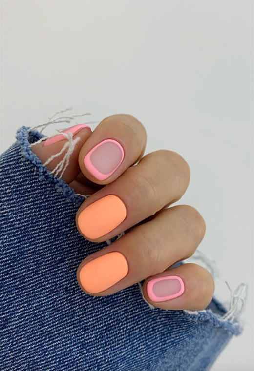 Se i neon di solito sono troppo per te, ricoprendoli con un soprabito opaco potrebbe aiutare a tonificarli quanto basta. I neon arancioni e rosa sono una combinazione facile resa ancora più sofisticata dall'aggiunta di uno spazio vuoto al centro delle unghie accentate.