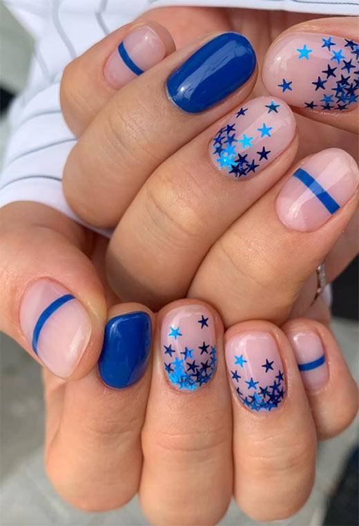 Non devi essere un americano per scuotere questa nail art, anche se questo look è abbastanza adatto per l'indipendenza americana. Gli adesivi con la stella blu sono disponibili sia in azzurro scuro che in azzurro, e insieme sembrano super brillanti come risultato, mentre altre unghie hanno solo bisogno di una striscia di blu per avere un impatto.