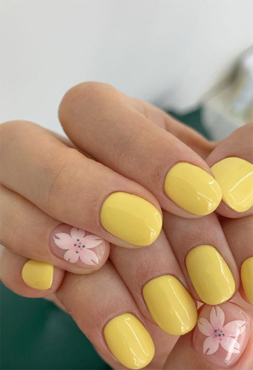62. Unghie estive giallo limone con accento floreale