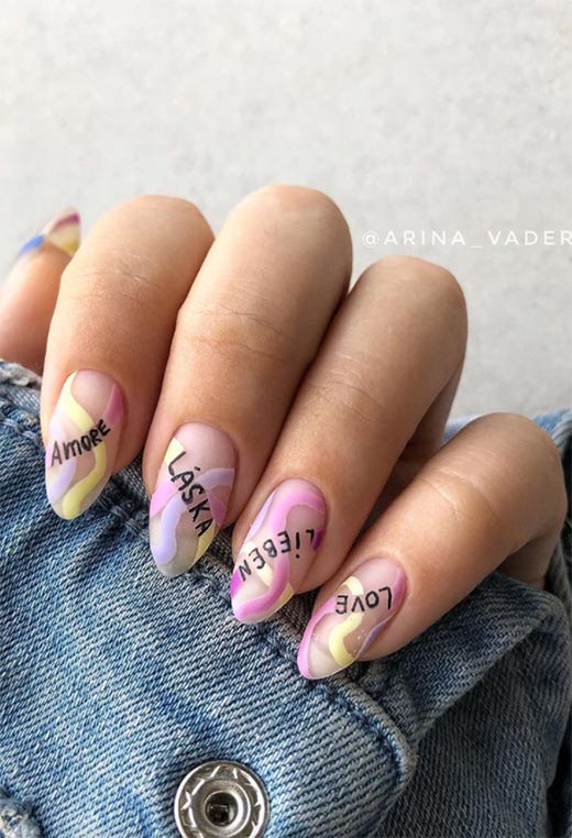Adoriamo questa allegra combinazione di nail art e scritte fluide. Lungo, le unghie nude erano dipinte con graziose, spesse passate di pastello, e poi sovrapposto con la parola "amore" scritta in cinque lingue diverse!
