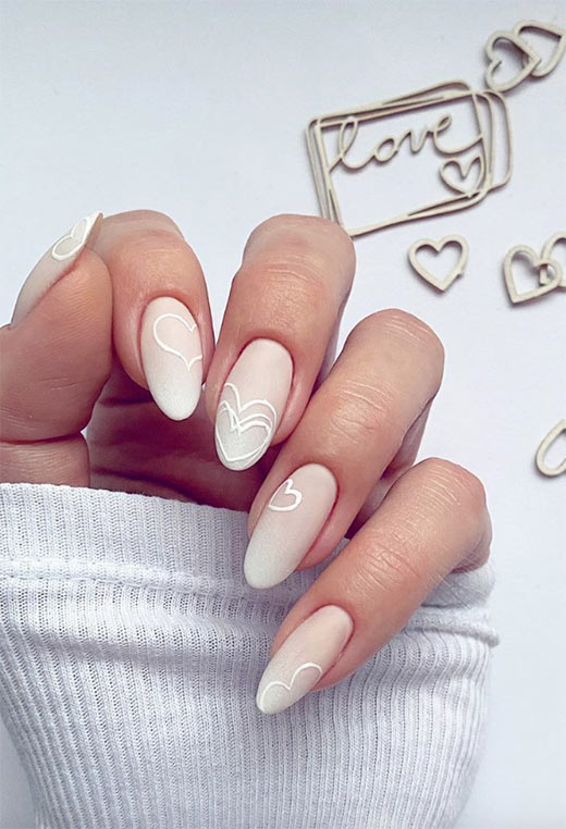 Adoriamo questo tocco minimalista di nail art a lungo, unghie a forma di mandorla poiché è semplice ma di grande impatto. Le unghie erano dipinte con un gradiente dal rosa opaco al bianco, che è già un bell'aspetto da solo, ma poi sono stati aggiunti piccoli cuoricini a base di linee qua e là su diverse parti di ogni unghia per aggiungere quel disegno abbozzato, tocco stravagante.