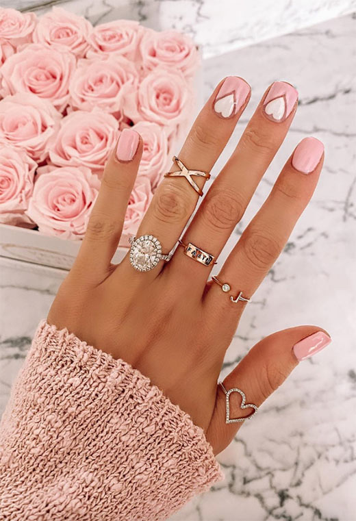 Questa manicure è davvero carina ma incredibilmente semplice da realizzare! Dipingi semplicemente le tue unghie con la tua tonalità di smalto nude rosata preferita, e poi aggiungi uno strato di glitter argento e alcuni piccoli cuori bianchi raggruppati dove desideri.