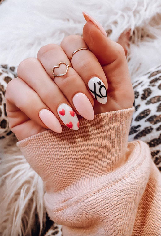 Alcune idee per le tue unghie accentate, con un motivo a cuore rosso e bianco sull'anulare e un XO accentato da un cuore sull'indice. Se desideri che le tue unghie di San Valentino siano un po' più sottili, mantieni la storia dei colori più semplice disegnando sui cuori e XO sulle unghie accentate nella stessa tonalità rosa del resto delle mani.