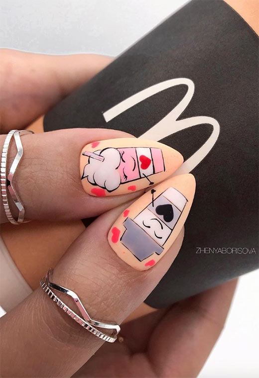 Se il tuo appuntamento per il V-Day includerà un appuntamento per un caffè o se sei solo un semplice vecchio dipendente dalla caffeina, questa adorabile nail art di San Valentino potrebbe essere molto divertente! Questi cartoni animati di caffè e frappè possono essere disegnati su qualsiasi tipo di manicure con un pennello sottile per nail art, mentre i cuori circostanti possono essere a mano libera o stampati.