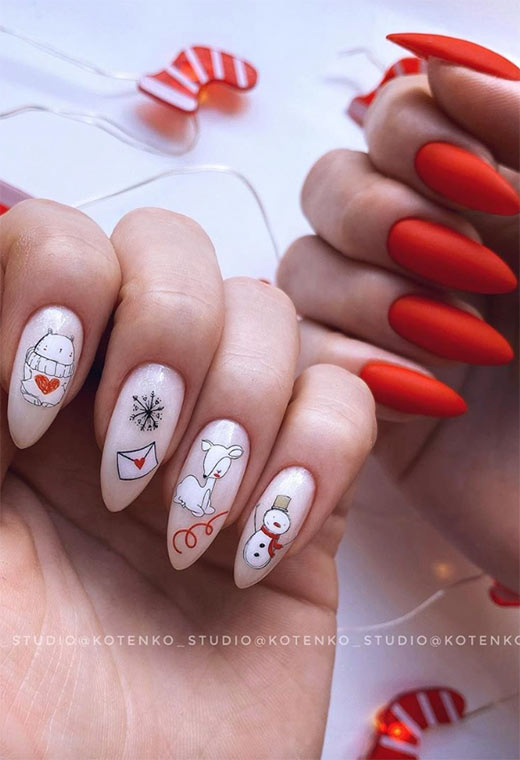 Febbraio può riguardare tanto il gelo e la neve quanto il giorno di San Valentino, quindi adoriamo questa combinazione di amore e motivi invernali. Ci piace anche l'unicità di avere una sola mano decorata con nail art giocose, mentre l'altro è dipinto di un rosso vivo.