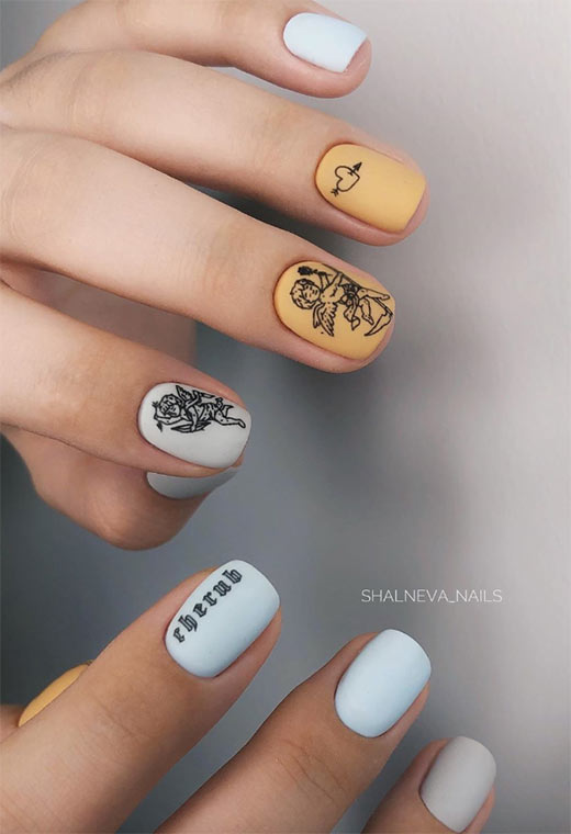 I disegni per le unghie di San Valentino non devono essere tutti nei toni del rosso e del rosa, come dimostrato da questa elegante manicure arancione e blu. Uno strato di finitura opaca ammorbidisce le sfumature e dona un aspetto antico che funziona magnificamente con i timbri della vecchia scuola di Cupido, la parola "cherubino, ' e un cuore trafitto da una freccia.