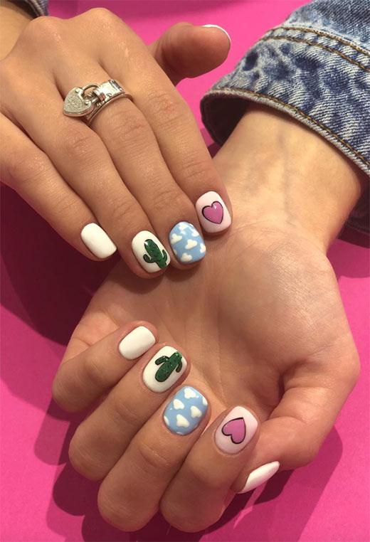 Vivi in un posto caldo? In quel caso, questa arte ispirata al deserto con cactus e cieli blu potrebbe adattarsi meglio alla tua nail art di San Valentino! Assicurati solo di decorare un dito con un cuore, così la gente sa che periodo dell'anno è.