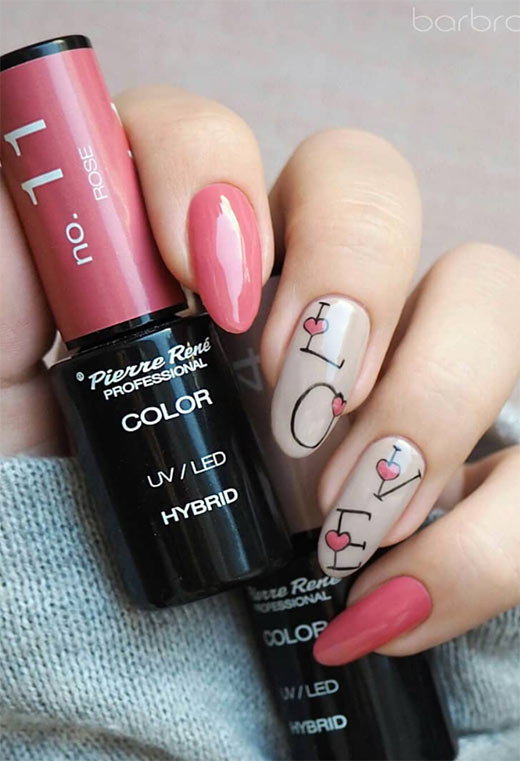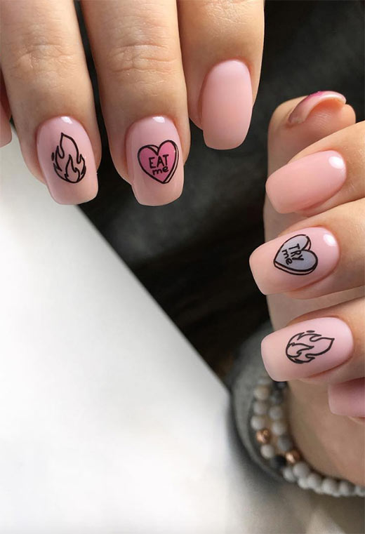 Una delle parti migliori di San Valentino è ricevere caramelle sfacciate e leggere cosa dicono! Queste semplici caramelle sono anche facili da adattare alla nail art, con un design che funziona bene sulle unghie rosa tenue. Un disegno a fuoco sull'anulare aggiunge un po' di pepe al look.