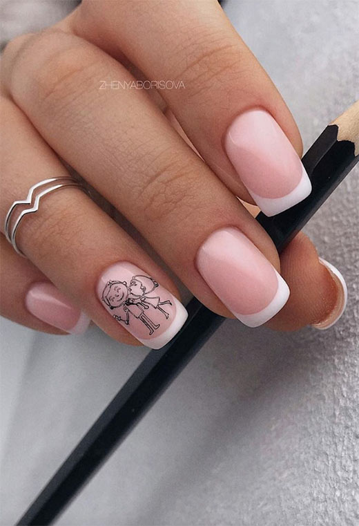 La manicure francese non va da nessuna parte, nemmeno a San Valentino! Però, puoi dare alle tue mani un tocco romantico aggiungendo uno schizzo carino al tuo chiodo accento preferito.