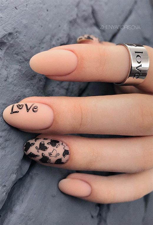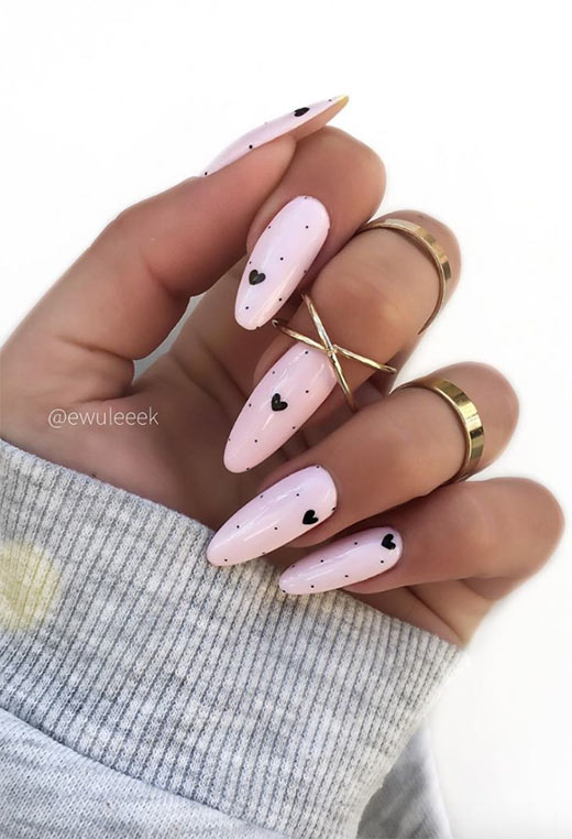 Per finire le cose, qui hai una nail art di San Valentino facile che puoi fare da solo o che hai fatto in pochi secondi da un professionista. Sopra la base rosa, i piccoli pois hanno un tocco retrò, mentre i cuori neri posizionati casualmente danno le vibrazioni di San Valentino.
