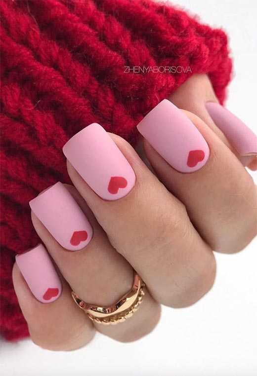 Questa è un'altra manicure con i cuori capovolti dipinti appena sopra la cuticola, che è un modo semplice e veloce per ottenere le unghie del V-Day. Adoriamo il contrasto tra la forma arrotondata dei cuori rossi con la forma quadrata delle unghie.
