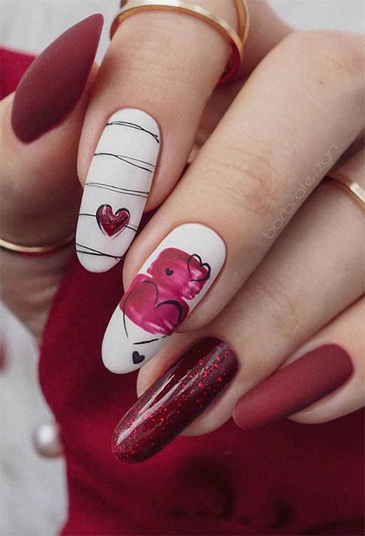 Se sei un tipo stravagante, adorerai questa manicure forte e drammatica:le estensioni delle unghie extra lunghe sono un must! Il pollice è rosso, fungendo da accento, ma il bianco è la base perfetta per le altre unghie, che sono decorati con ombre, strisce, e diversi tipi di cuori per la massima gioia e amore.