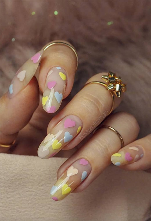 Se le parole che vuoi che le tue unghie di San Valentino evochino sono dolci, carino, o da ragazza, allora questo è il design da scegliere, e pensiamo che funzionerà su tutte le forme di unghie! Tutto ciò di cui hai bisogno è una mano di smalto trasparente o nudo, seguita da una varietà di timbri a forma di cuore color pastello.