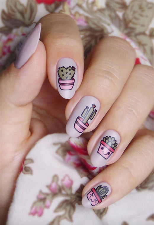 L'ossessione per le piante grasse potrebbe essere finita per alcune persone, ma amiamo ancora le abbondanti piante del deserto. I loro personaggi dei cartoni animati sono anche perfetti per il design delle unghie, e con pochi cuori e un po' di rosa, diventa una perfetta manicure da V-Day.