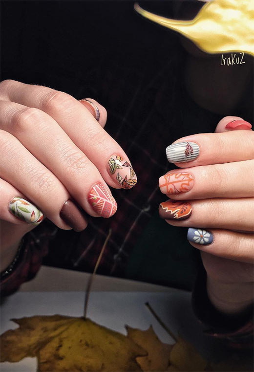 In questa idea delle unghie autunnali, le unghie sono tutte uniche dalle loro strisce alle loro foglie dettagliate ai loro colori solidi. Sii audace questo autunno dando a ogni unghia il suo design.