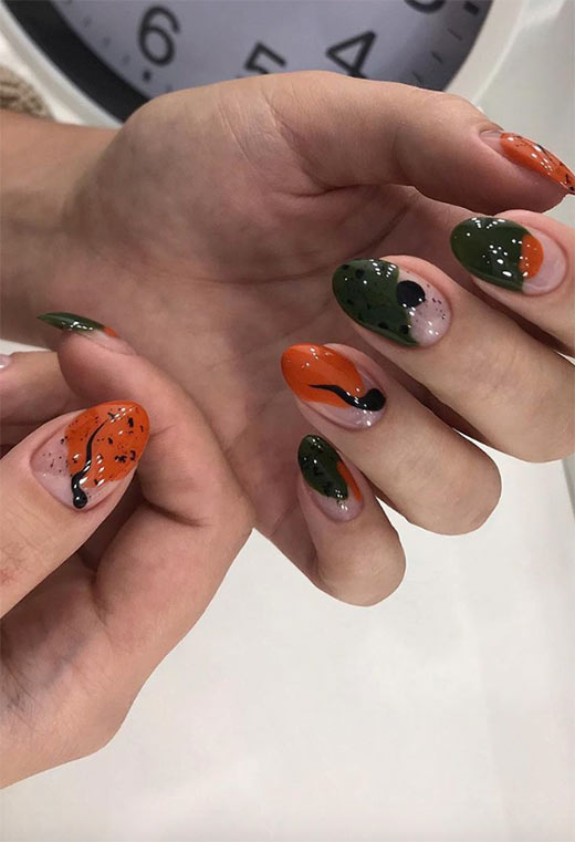 Voglia di zucche ma in modo più sobrio? Queste unghie combinano gli splendidi colori dell'arancione e del verde salvia con una forma più moderna. Gli scarabocchi neri simili a riccioli di zucca sono perfetti per i disegni delle unghie autunnali.